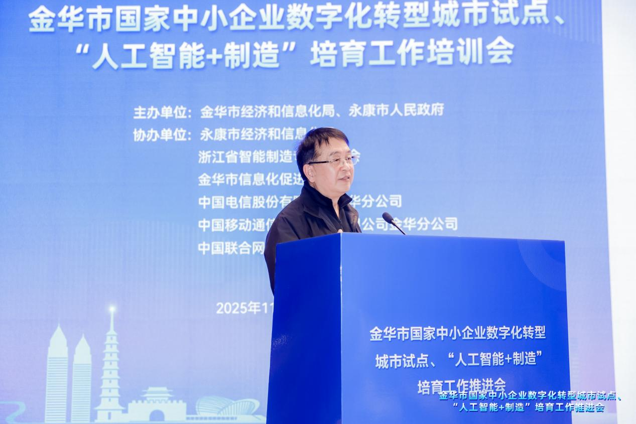 2025年11月12日,浙智专委卢耀辉副主任赴永康参加金华国家中小企业数字化转型城市、“人工智能+制造”培育工作培训会,并在会上作了主旨演讲。金华市副市长章旭升、经信局局长王兴国及金华市下辖各县市区分管领导、经信局负责人和企业代表参加工作培训会。